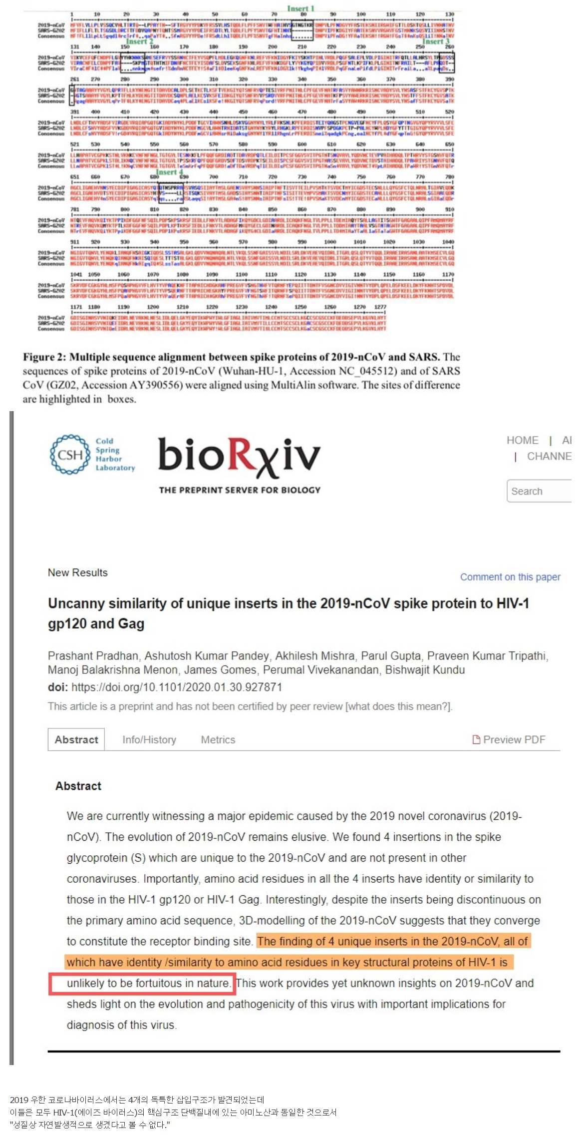 어제 저녁부터인가 저 bioRxiv 논문 (이라 부를 수 있을지..) 이 떠돌고 있는데요. 저 논문은 신종코로나의 일부 염기서열이 HIV 바이러스와 일치한다는 이야기인데.. 이미 저기 댓글에 많은 전문가들이 비판하고 있습니다. 일치하는건 사실이나 우연의 일치라고.