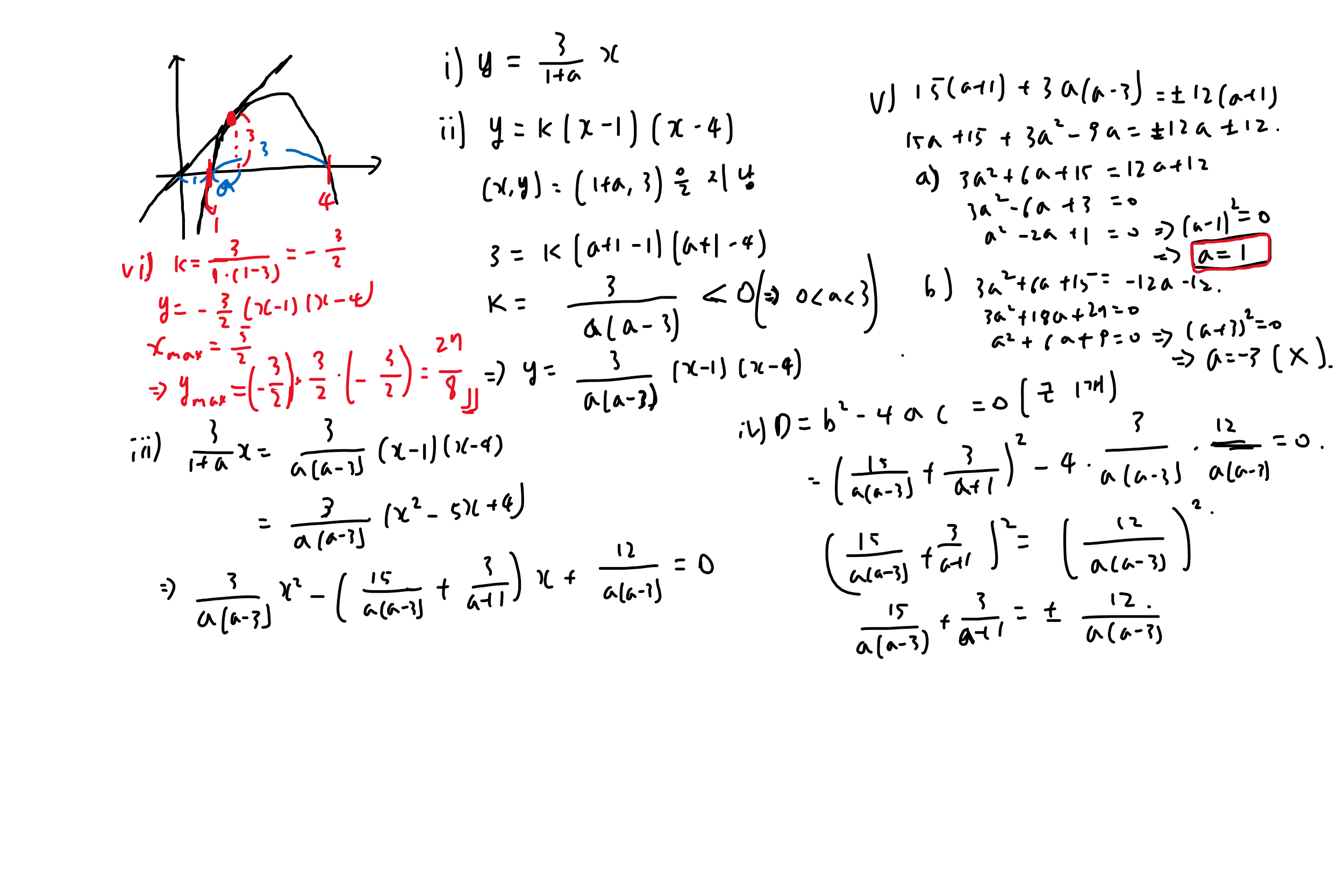 이차함수와 X축과의 두 접점, 일차함수와 이차함수가 한점에서 접함, 접점의 X좌표, 이차함수 최대값을 잘 응용해야 헐 거 같은데 그게 안되네요.