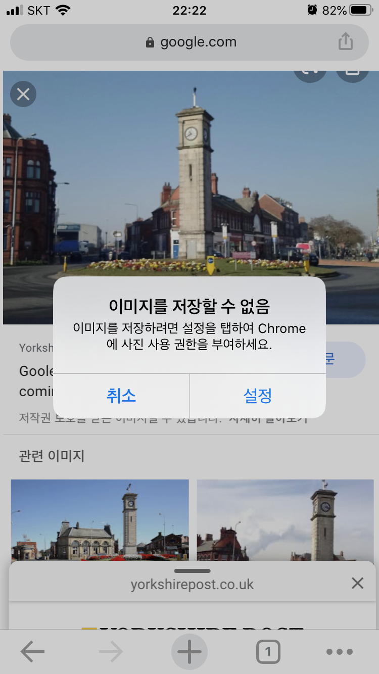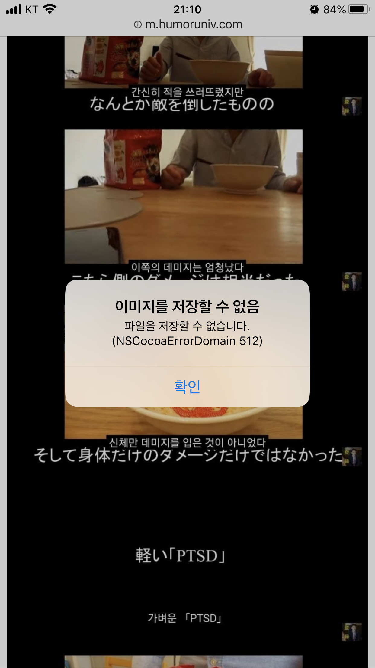 아마도 어제부터 모바일에서 사진 저장을 시도하면 위의 메세지가 뜨면서 저장이 안대여. ㅜㅜ