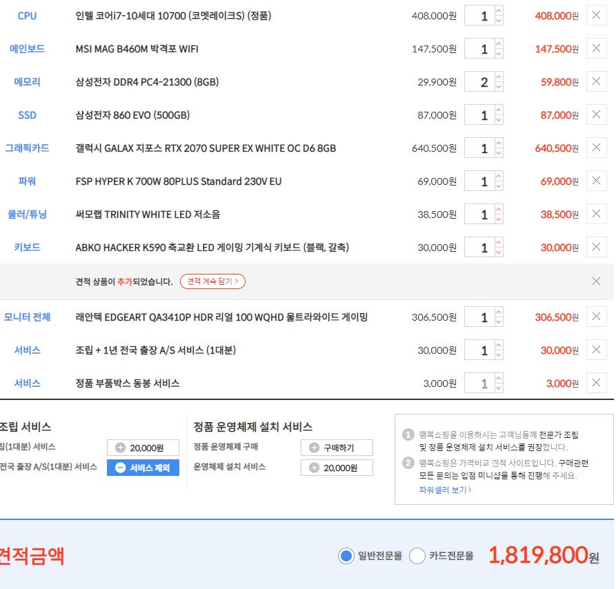 인생 첫 나만의 데스크탑을 맞추려고 합니다 용도는 롤, 스타2, 문명6, 그리고 영화감상, 유튜브, 인강시청, 학교과제문서작업 등등입니다. 사실 용도에 비해 너무 과한 오버스펙인 감도 있지않나 싶은데, 이왕 첫컴인거 좋게 맞추자 라는 심리가 있기도하고.. 근데 주변인들은 다들 오버스펙이라고하네용..저도 가진 예산에 비해 저정도는 좀 후달리기도하고요 메인보드는 제가 무선으로 인터넷을 이용해야할수밖에 없을것같아서 무선wifi 기능있는걸로 했습니다. 1. 용도에 맞게 적당하게 깎는다면 어느부분을 고쳐야할까요? 2. 파워가 마이크로닉스랑 fsp랑 주변인들 추천이 갈리던데 어떤 제조사 것이 좋은가요? 3. 모니터도 어디 껄 써야할 지 모르겠습니다. 4. 다른건 몰라도 롤만은 풀옵으로 돌리고싶습니다. 즉, 여기서 어떻게 낮추는가가 문제겠네요.. 그 외 기타 자잘한 부분 고쳤으면 좋겠다 싶은거 있으면 알려주시면 감사하겠습니다 참, 올린 그림파일이 제가 지불할 수 있는 예산 최대치입니다. (190만원쯤) 0