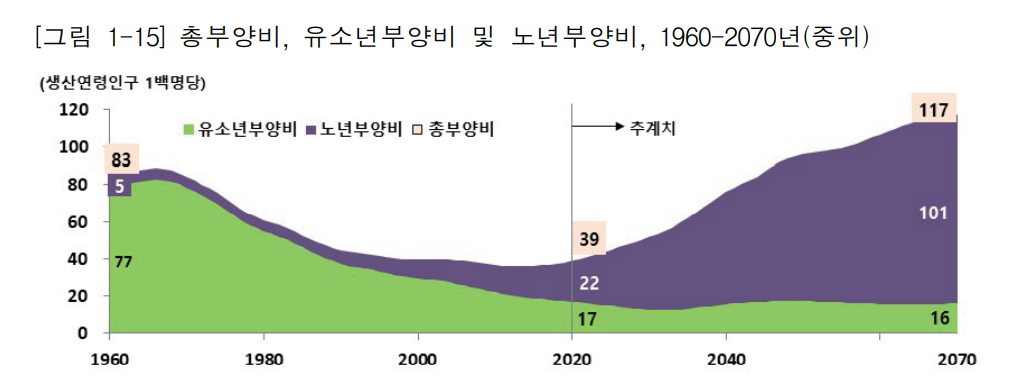 한국 인구구조의 아이러니는 지난 60여년동안 인구구조의 혜택을 제일 많이 받은 나라였고, 곧 닥칠 급격한 인구부양비 악화의 상당부분은 그 반동이라는 데 있습니다. 인구구조적 이득도 페널티도 모두 세계 최고수준인 특이한 국가죠.