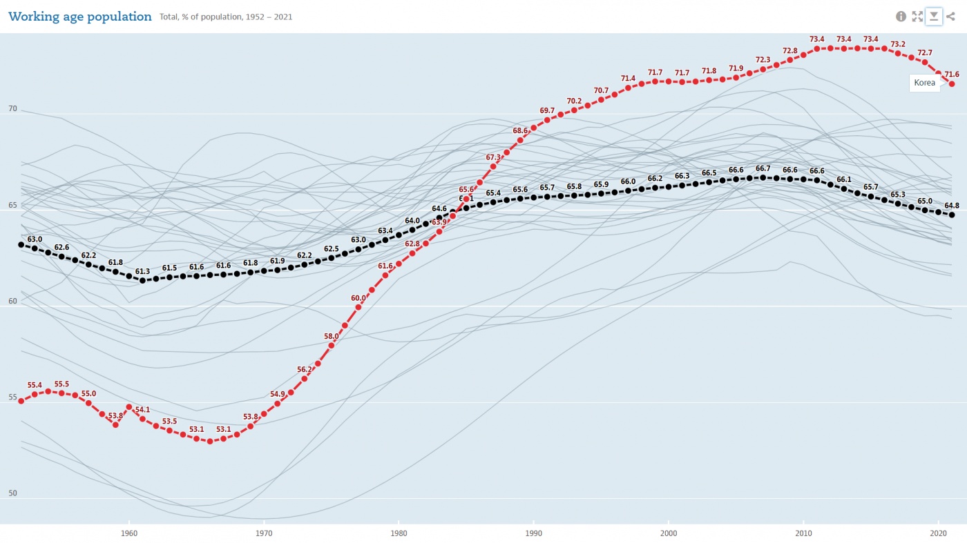 이는 한국의 생산가능인구 비율이 1990년 즈음부터 30년째 70%를 넘겨 타 OECD 국가 대비 튀게 높은 수준임에서 볼 수 있습니다. 물론 타 선진국도 인구학적 전환을 겪으면서 최근 생산가능인구 비율이 65-70%로 높은 수준이긴 합니다. 하지만 한국은 인구학적 전환이 워낙 급격하다보니 73%까지 올라갔습니다. 사실 이 비율이 70%를 그것도 꾸준히 넘기는 사례는 동북아시아와 젊은 외노자로 가득찬 걸프 만 산유국을 제외하면 찾기 힘듭니다. 최근의 매우 낮은 출산율로 아동 인구 비율도 적은데, 베이비붐 세대가 아직까지는 노인이 아니어서 노인 인구 비율도 낮은 구도 덕분입니다. 참고로 인구구조 이야기할 때마다 줄창 소환되는 일본도 정점은 70%에 불과(?)했습니다.