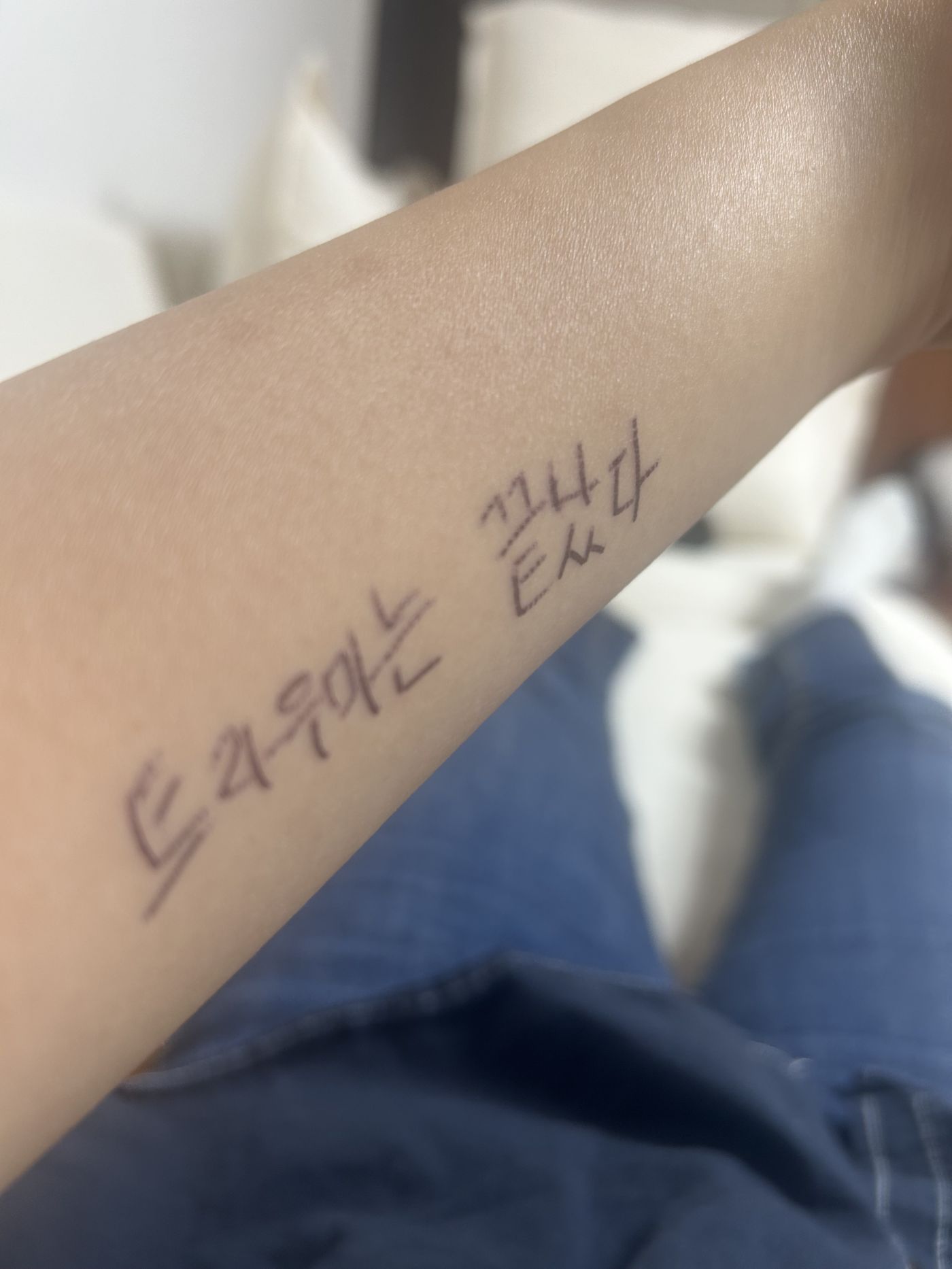 오늘 무슨 생각이 들어서인지 갑자기 팔에 볼펜을 들고 “트라우마는 끝났다” 라고 적었습니다.