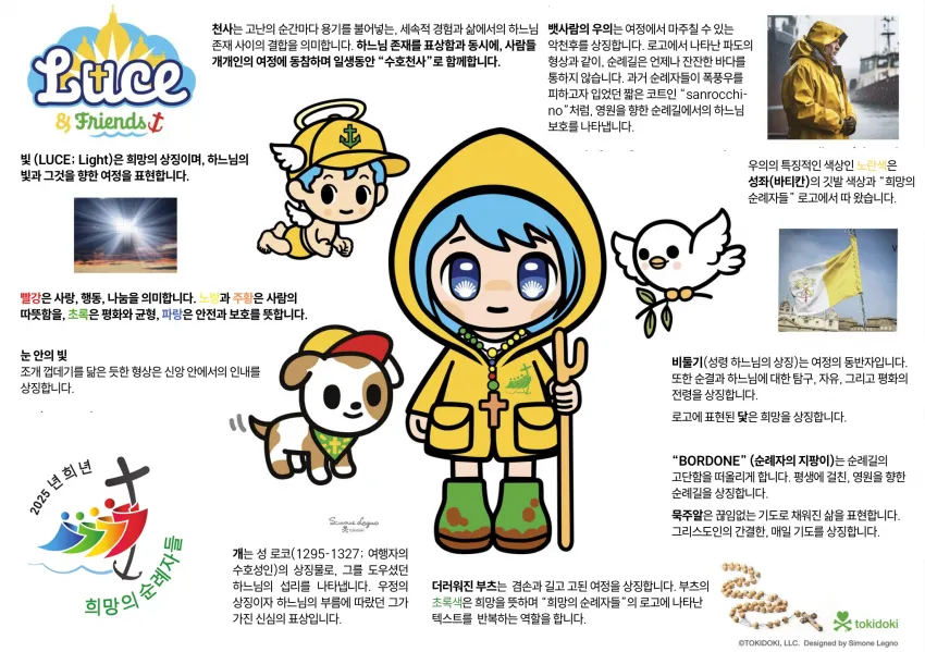 마스코트는 기본적으로 '순례자'를 상징하며, 개별 구성 요소들은 이러하다 합니다 : 노란 우의는 폭풍우를 피하기 위한 뱃사람의 우의입니다. 조개 껍데기 모양으로 빛나는 눈의 조개 껍데기는 인내를 상징한다 합니다. 목에 걸린 묵주는 끊임없는 기도를, 십자가는 십자가를 나타냅니다. 진흙으로 더럽혀진 장화는 고된 여행길의 기록이며, 지팡이는 끝없는 여정의 도구입니다. 아, 가슴의 희년 로고는 파도를 형상화한 모양입니다. 그렇게 파도의 끝에는 십자가로 만들어진 닻이.