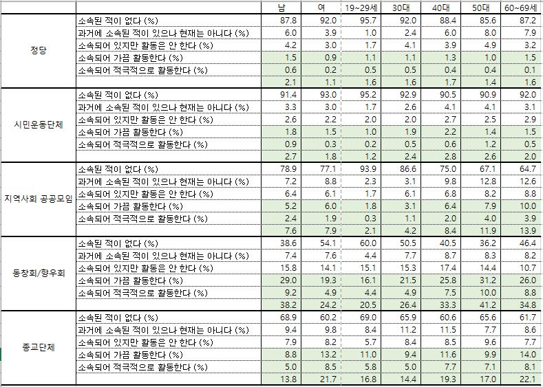 그냥 사회단체도 아니고, 정당, 시민운동단체, 지역사회 공공모임, 동창회 및 향우회, 종교단체를 별도로 설문합니다. 우리나라 공공영역은 생각보다 성실합니다.