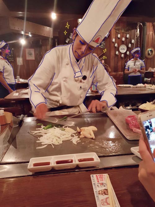 인터넷에서 여긴 그리 추천하지 않았던 것 같은데. 일단 배가 고프니까 뭐든지 잘 들어간다. 선한 표정의 아저씨가 오더니 저글링 쇼 같은 걸 하면서 고기를 굽기 시작한다. 이게 뭐람, 세상에. 이렇게 멋진 쇼를 보여주는 데다, 일단 먼저 구워 준 감자도 상당히 맛있었고, 에어컨 바람에 잔뜩 들뜨기까지 한 동생과 내가 어디서 주워들은 일본어를 마구 내뱉는다. 오! 사무라이! 스테키! 환호성에 꽤나 덤덤하던 아저씨가 사무라이라는 단어를 듣더니 삼단 저글링을 보여준다. 한참 물개박수를 치고 나니까 목이 마르다.