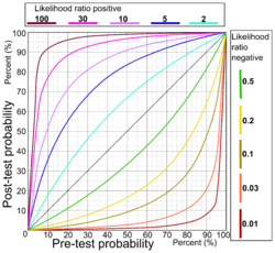 댓글의 그림처럼 질병의 사전 확률이 너무 높은 경우, 음성우도비가 0에 가깝다고 한들 '사후확률'이 크게 감소하지 않으며, 역으로 '사전확률'이 너무 낮은 경우 양성우도비가 높다고 한들 '사후확률'이 크게 증가하지 않습니다.