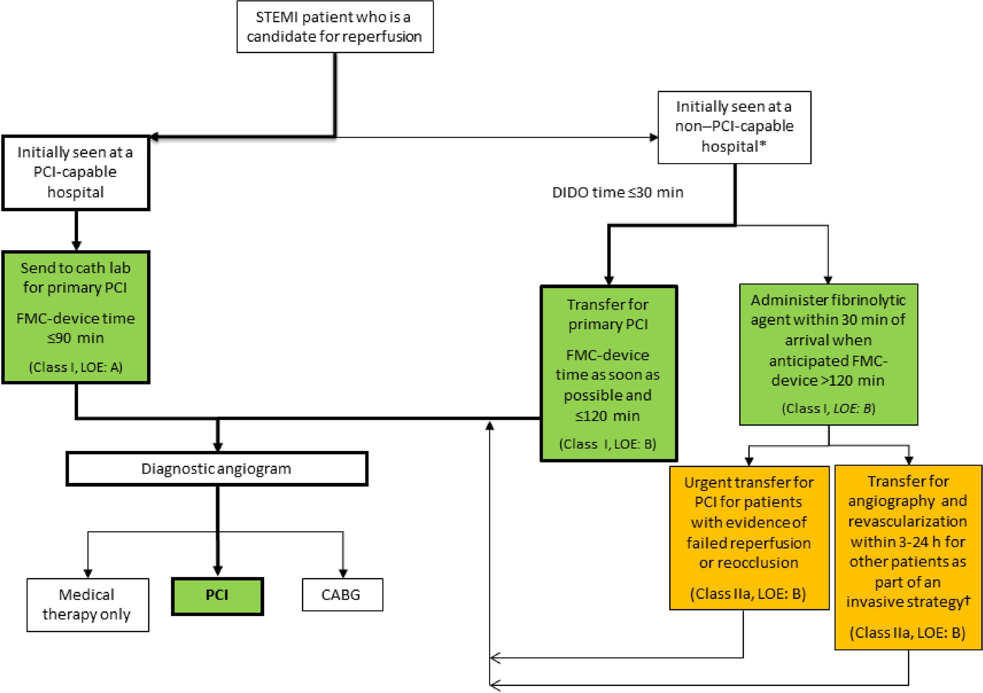 '먼저 ST가 상승한 환자가 오면 PCI(인터벤션)이 가능한 병원인가 아닌가에 따라 갈라지게 되는데, 가능한 병원인 경우 바로 PCI 시행을, 아닌 경우에는 2시간 이내에 인터벤션 할 수 있는 곳으로 전원이 가능할 시 전원을, 아니면 혈전용해치료를 한 후 전원을 보내라.' 로 요약이 가능할 것 같네요.
