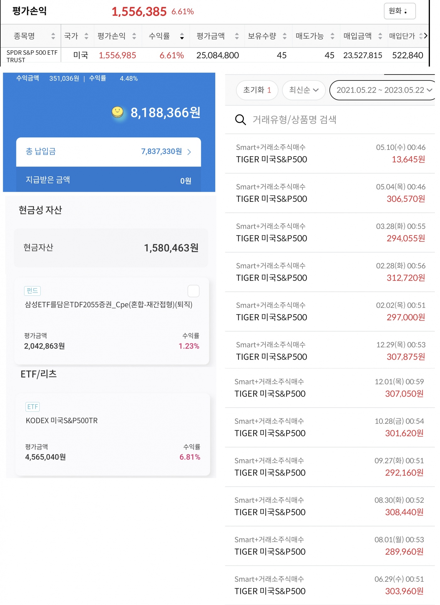 당초 세웠던 계획과 달리, 인사이동 후 너무 바빠져서.. 돈을 쓸 여유가 안 생기다보니 매월 남는 여윳돈은 비정기적으로 spy에 비정기적으로 50만원 가량 추가로 투자를 했습니다.