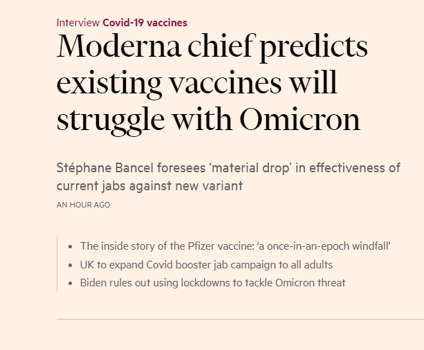 Moderna chief predicts existing vaccines will struggle with Omicron(유료)