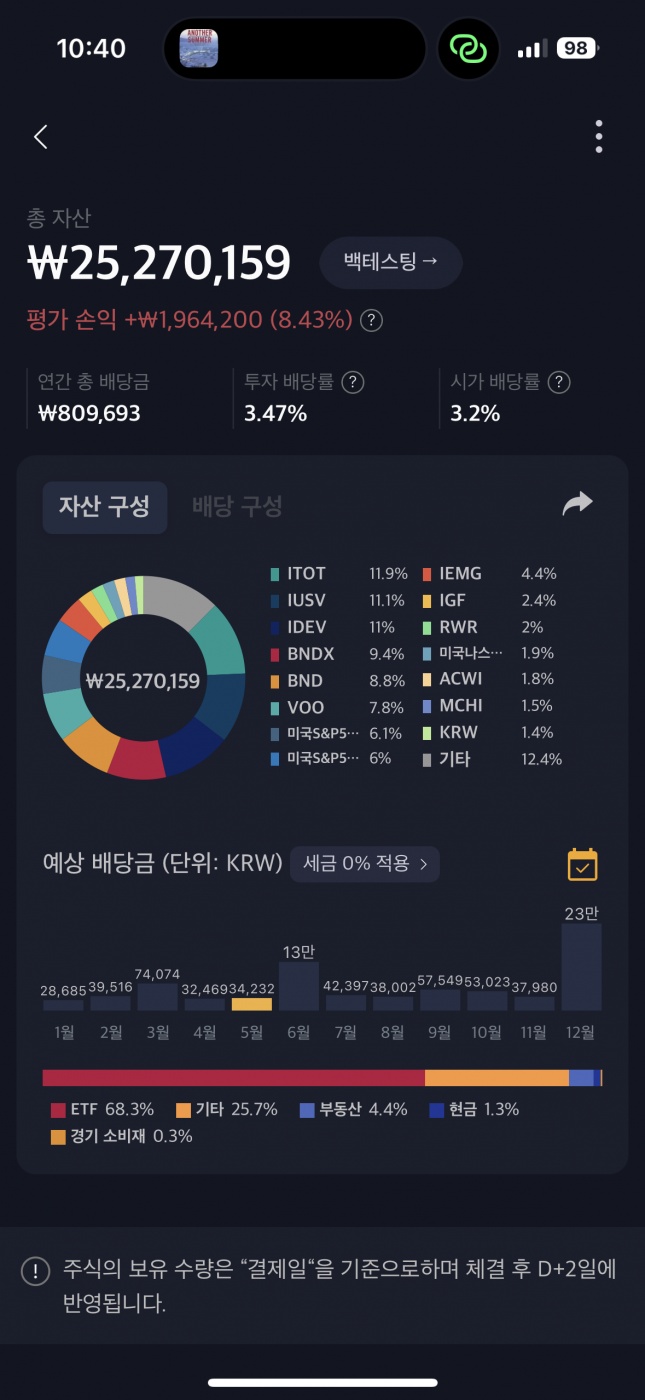 그동안 너무 안전자산에 투자한 것 같기도 해서 주식 쪽으로 눈을 돌렸었는데 아는게 없어서 고민 중이었는데요. 유투브로 수학 증명하는 영상 보는데 어떤 분이 참 신박하게 잘 하시더라고요. 구독자가 금방 늘더니 자신이 어떤 사람인지 밝혔는데 미국에서 수학 박사하고 한국 스타트업에서 투자 알고리즘을 만들고 있다고 하더라고요. 핀트라는 앱이었는데... 그래서 오 이런 사람이면 좀 잘 만들 것 같아! 라고 생각하고 약 1년 전부터 매주 30씩 넣어봤는데 생각보다 수익률이 잘 나왔어요. 근데 23년은 어차피 장이 좋았잖아요.