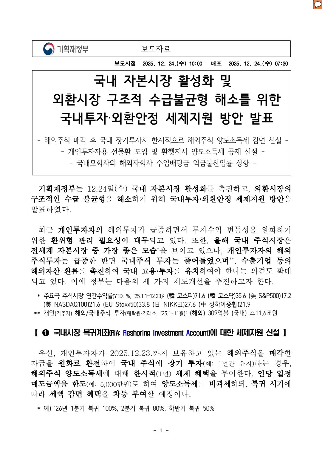 국내시장 복귀하면 양도세 비과세라고 해서 처음엔 국내는 원래 양도세 없지 않나 했는데 자세히 보니 환헷지 걸고 투자하면 양도세 줄여주는 신규 절세 계좌를 오픈할건가 봅니다. 이거 신박한데? 저는 일단 생기면 한도 만큼 갈아탈겁니다. 어차피 지금 환율도 고점이라고 봐서...