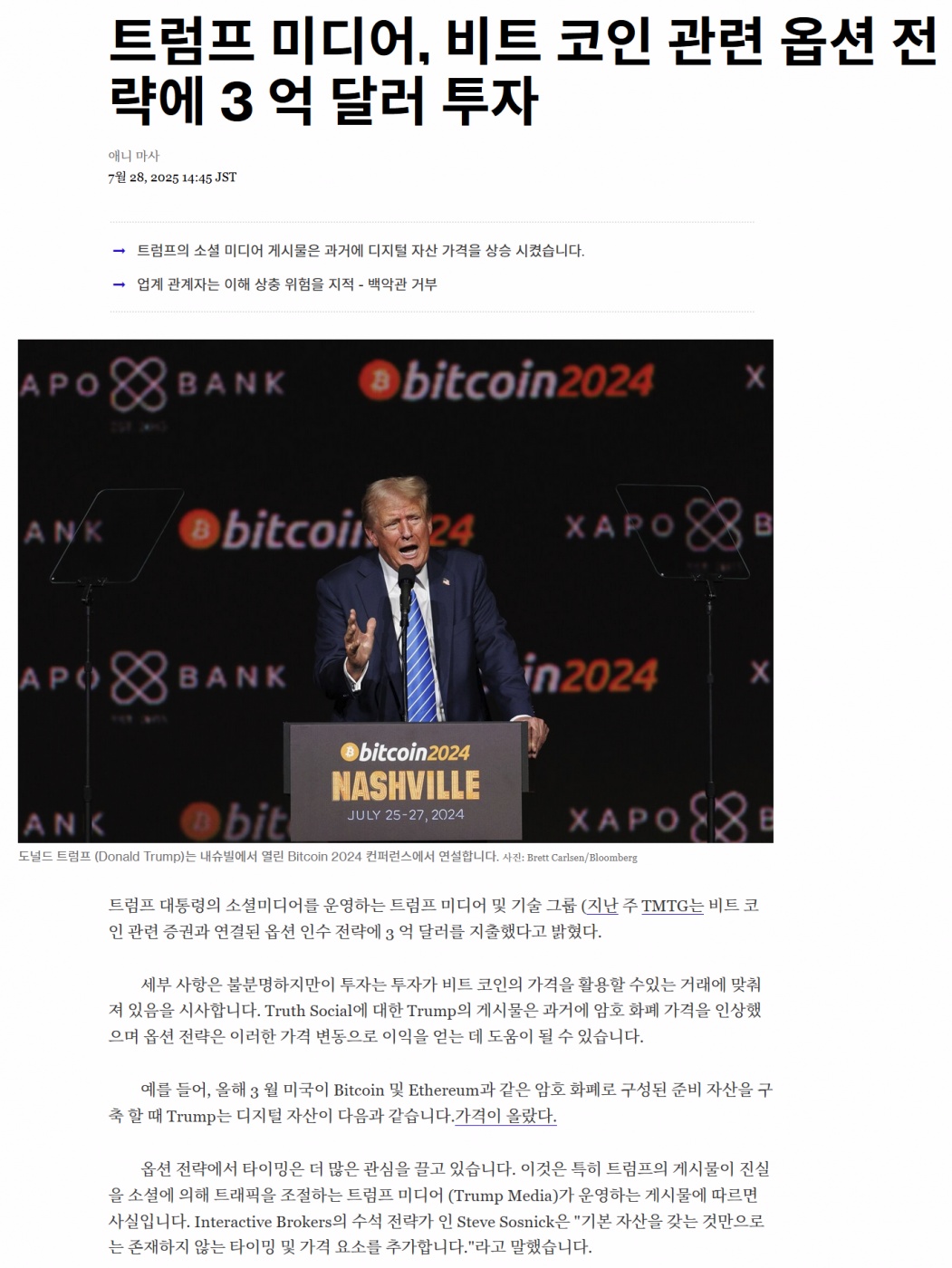 트럼프 대통령 일가의 회사가 BTC 옵션 거래에 3억 달러를 투자했다는 며칠 전 블룸버그 보도입니다. 진심으로 시장을 올렸다, 내렸다하며 벌 생각인 것 같군요?? (TMTG는 이번의 옵션 투자 얘기와 별개로 BTC나 관련 자산을 약 20억 달러 상당 소유하고 있습니다.)