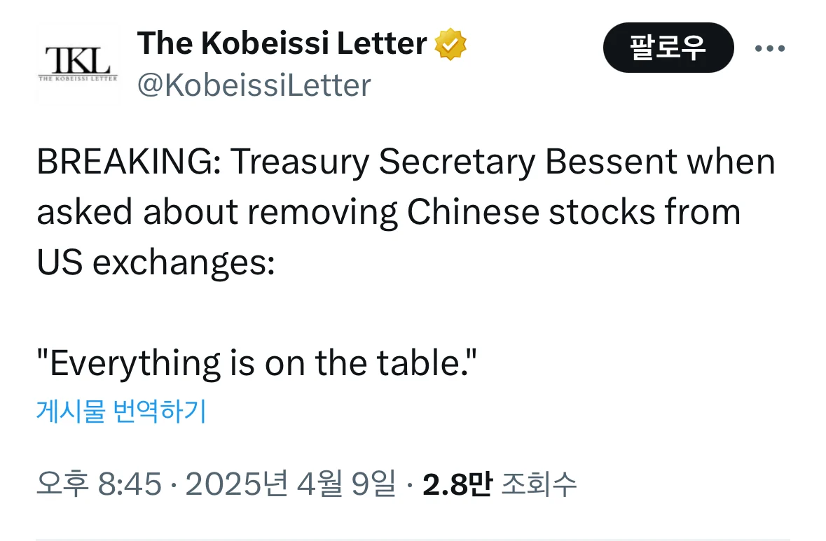 아 그리고 30분전에 중국이 미국에 대한 보복관세 80% 발표했습니다. 중국의 대미 관세는 내일 발효예정.
