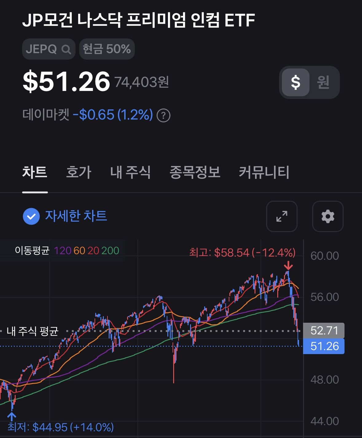 voo, qqqm, schd, dgrw만 1000원 모으기 하고 있었는데 이틀 전부터 spyi, jepq도 추가로 모으고 있읍니다. 꽤 내려와 있는거 같아서...