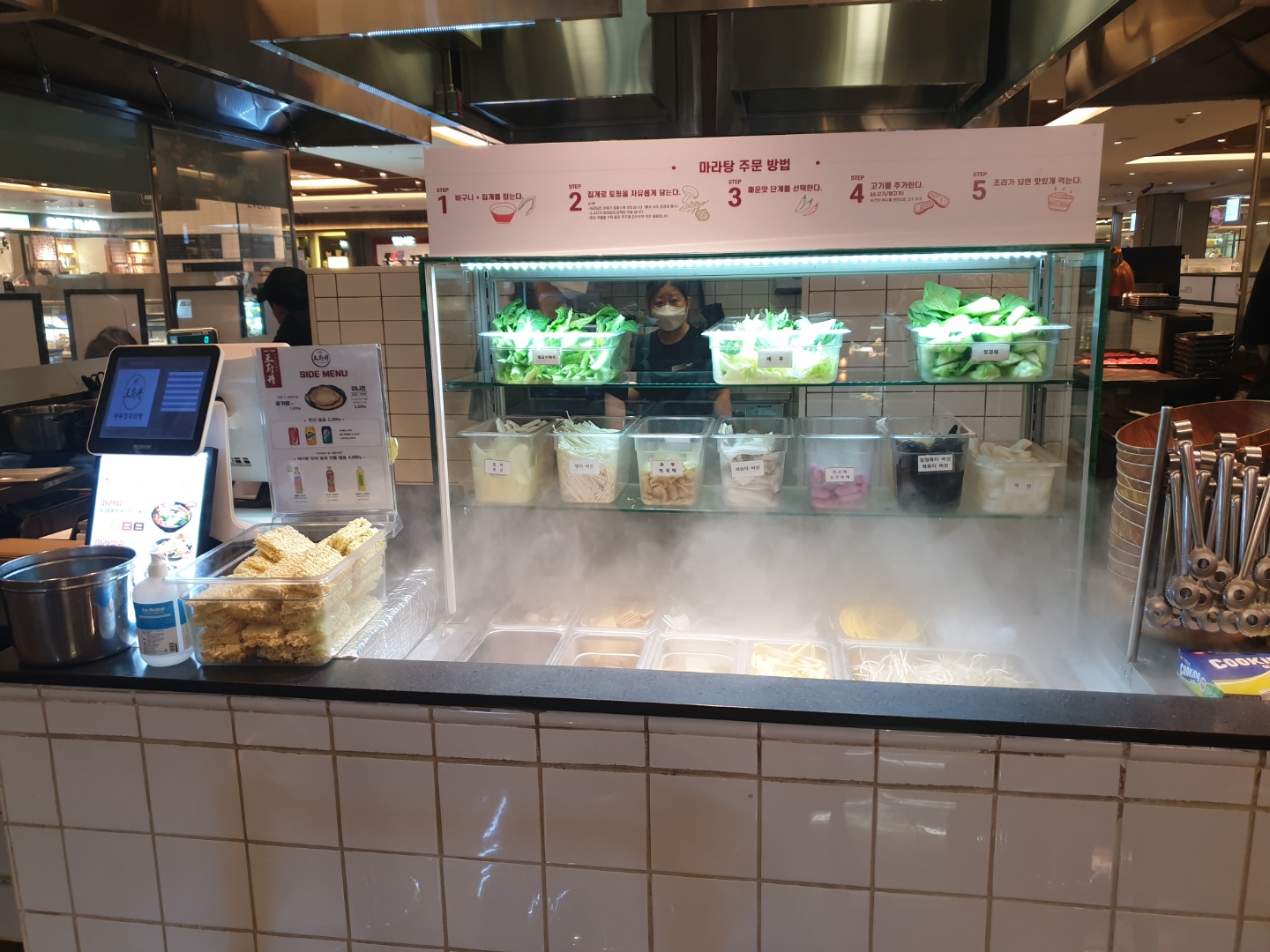 그릇에다 원하는 재료를 먹을만큼 담아서 무게로 가격책정 한 뒤에 먹는 방식입니다. 9천원 이상부터 가능한데 생각보다는 적게 담아야 양도 딱 맞고 가격도 적당해집니다. 개인적으로는 숙주, 배추, 청경채 등의 야채를 많이 넣어먹는게 맛있습니다. 버섯, 두부, 면, 떡, 소시지, 어묵, 새우 등의 종류도 다양하게 잘 구비되어 있어서 취향껏 조합하시면 됩니다. 이번에 방문했을땐 이례적으로 고수가 없어서 사진에 찍히지 않았는데 항상 맨 윗줄에 한가득 구비되어 있습니다. 다 담았다면 무게를 재면서 고기추가 여부와 매운맛 단계를 선택하게 됩니다. 고기는 소/양 두가지가 있고, 매운맛은 하얀국물,1,2,3 총 4단계가 있습니다. 저는 항상 1단계에 소고기 추가 꼭 해서 먹습니다. 계산대 바로 왼쪽에 단무지도 있으니까 꼭 종지에 퍼가시는거 잊지 마시고, 그 옆에 추가소스 두가지가 있는데 원하시면 더 넣으셔도 됩니다. 더 넣으면 더 시큼해지고 더 얼얼해집니다. 저는 굳이 넣지는 않습니다.