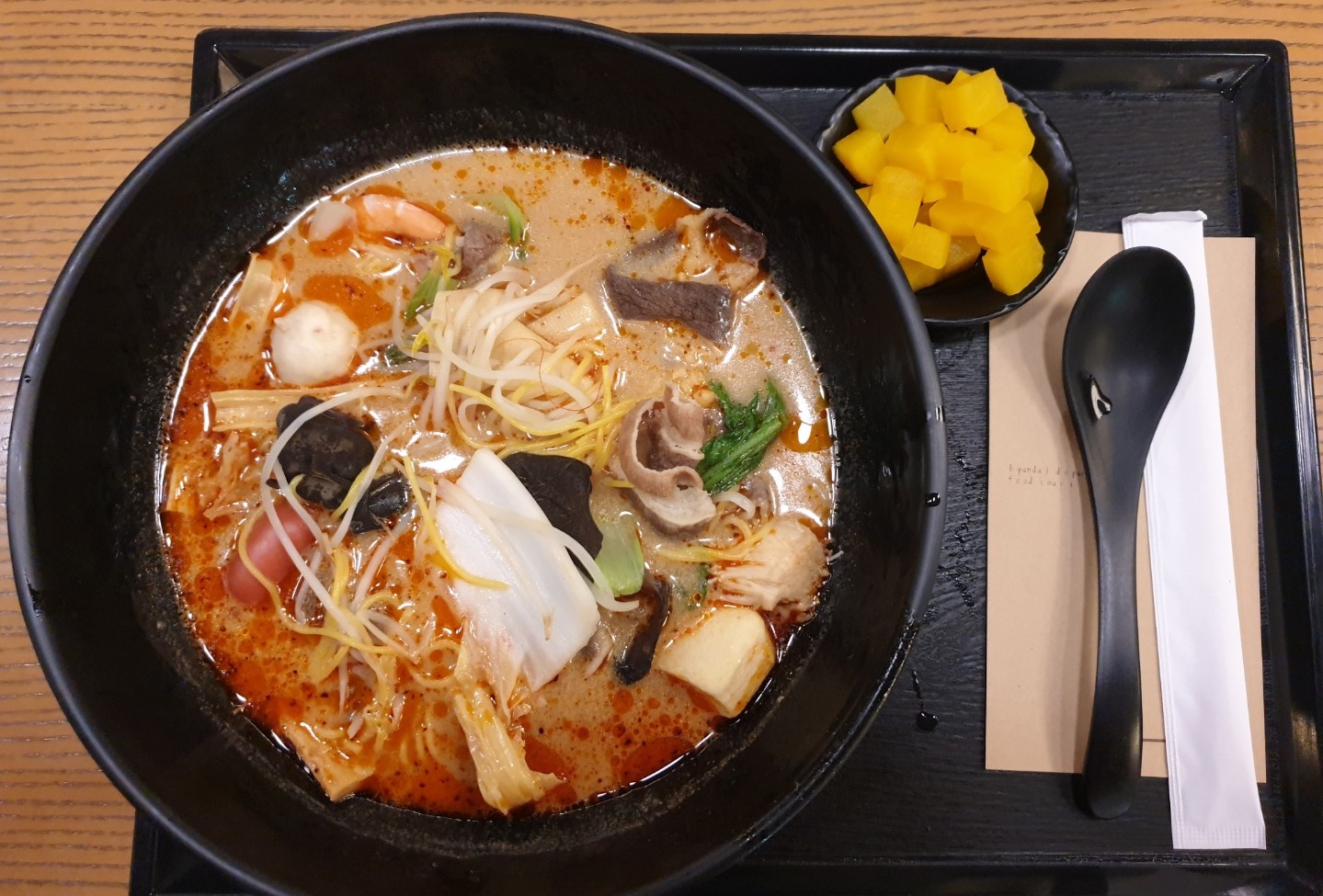 먹는자리는 일열로 10석정도 구비되어 있고, 바로옆 푸드코트에 갖고들어가서 드셔도 됩니다. 점심시간엔 근처 회사원들이 어마어마하게 몰려드는 곳이니 자리선점 잘 해두시길 바랍니다. 피크타임 피해서 간다면 널널하게 드실 수 있습니다.