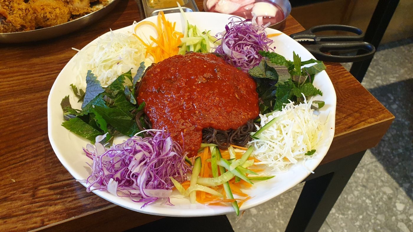 같이 먹은 비빔국수는 그냥 어디서나 먹어볼 수 있는 무난한 맛이었습니다. 튀족의 느끼함을 잡아주는 서브메뉴로 같이 드시기에 좋습니다.