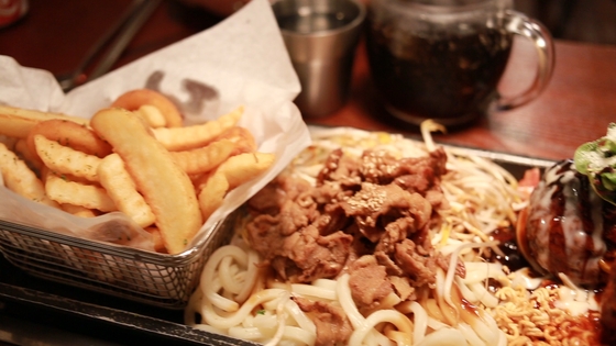 감자튀김, 숙주불고기, 볶음우동, 라면땅, 함박스테이크, 오븐구이치킨, 샐러드.