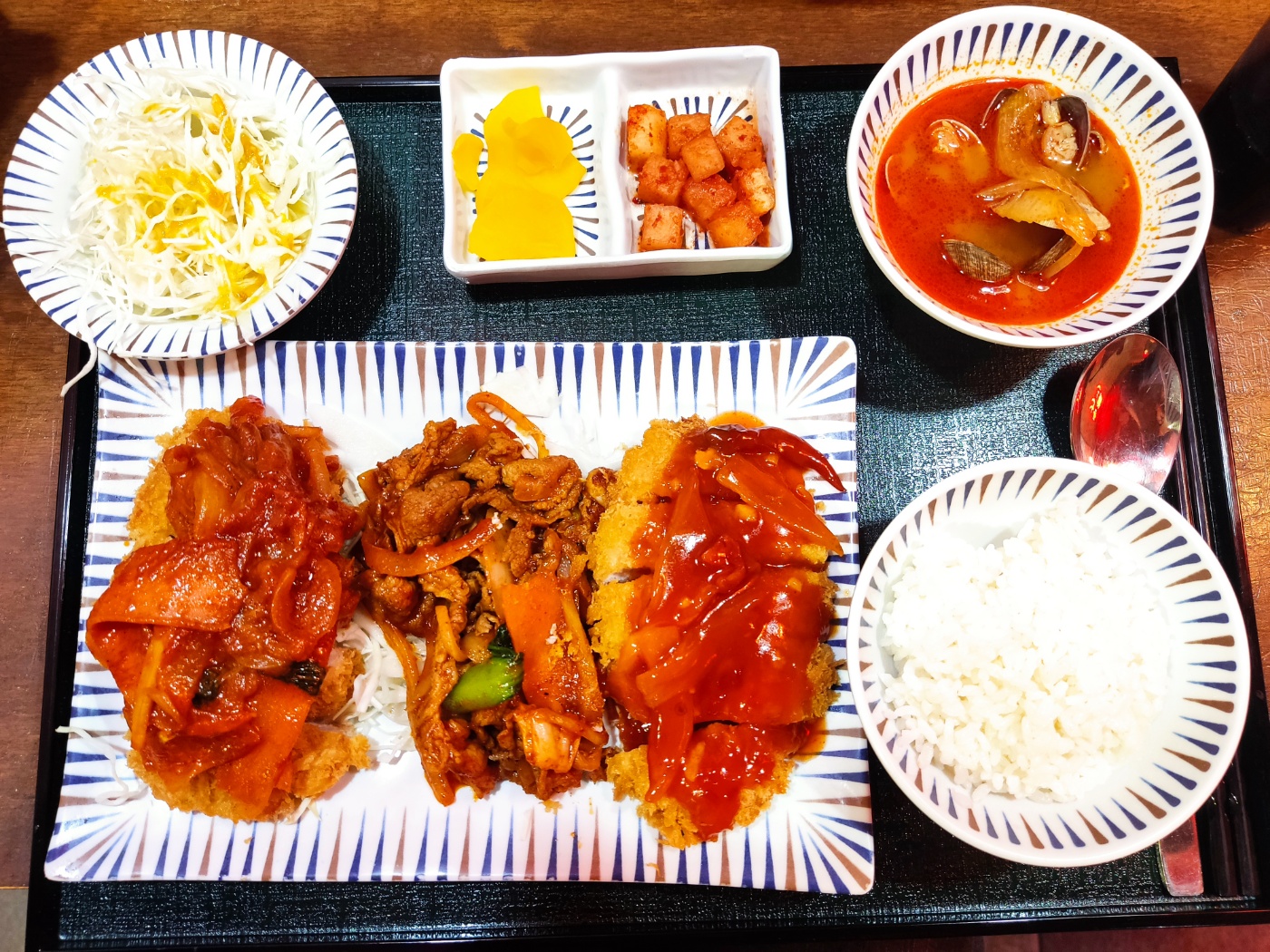 남성들의 소울푸드인 제육+돈가스에 짬뽕국물이 나오는 메뉴가 있는 집.