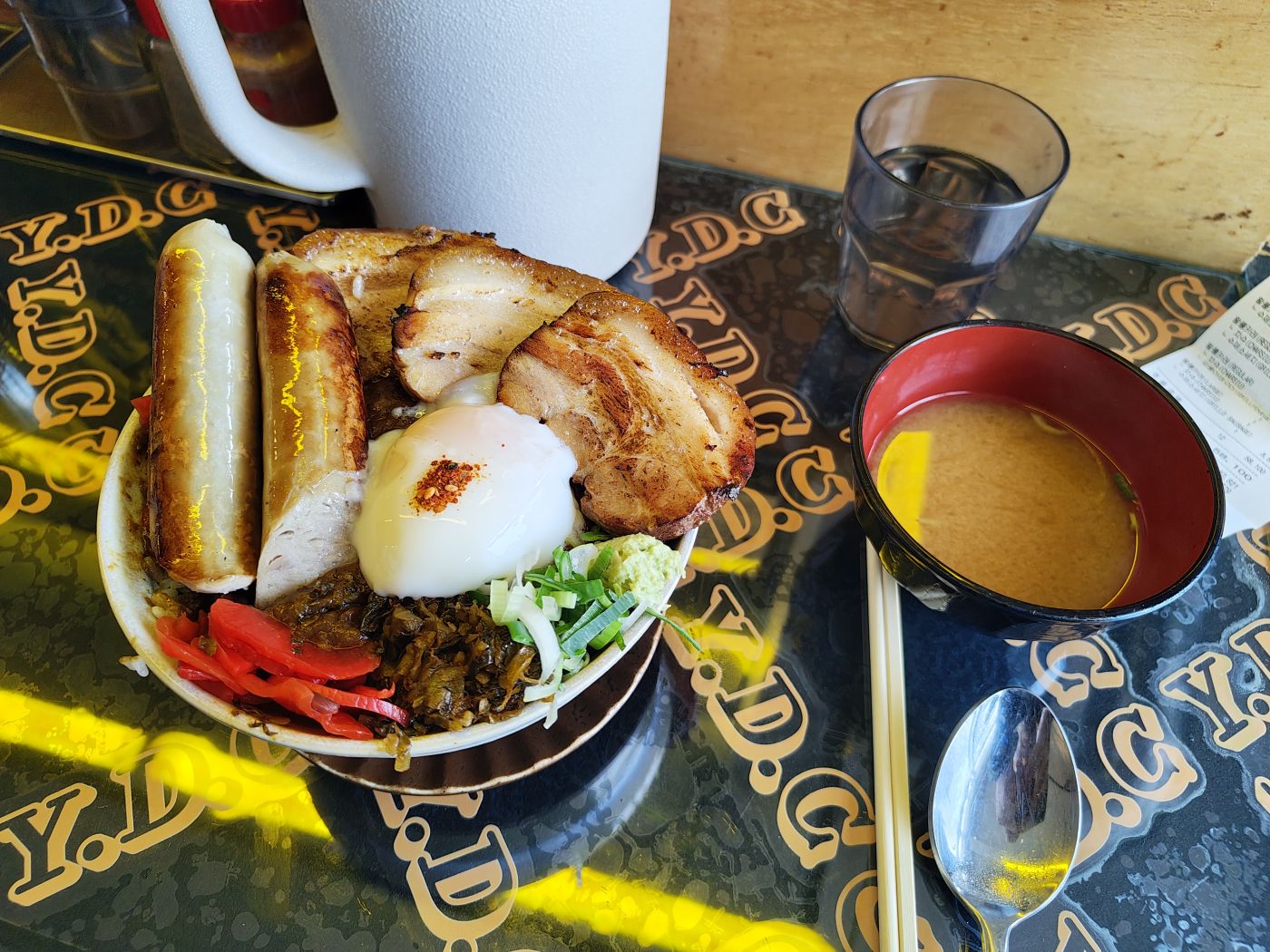 기본 카레밥에 토핑(야채 및 소시지, 차슈 등)을 선택하여 키오스크로 주문하면 철판구이해줍니당