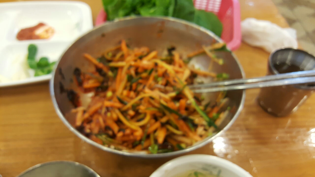 비주얼은 보통 생각하는 물회와는 다릅니다. 애호박과 쪽파가 뒤덮고 있는 그릇을 열심히 밑의 회와 양념과 김과 다른 야채들과 함께 비벼놓고 보면, 사진에서 보시듯(초점이 안 맞네요 ㅠ) 오히려 회무침에 가까운 비주얼인데, 먹다보면 회나 야채의 수분인지 물이 제법 고입니다. 잘은 모릅니다만 물이 별로 없는 스타일이 부산식이라고 하네요.