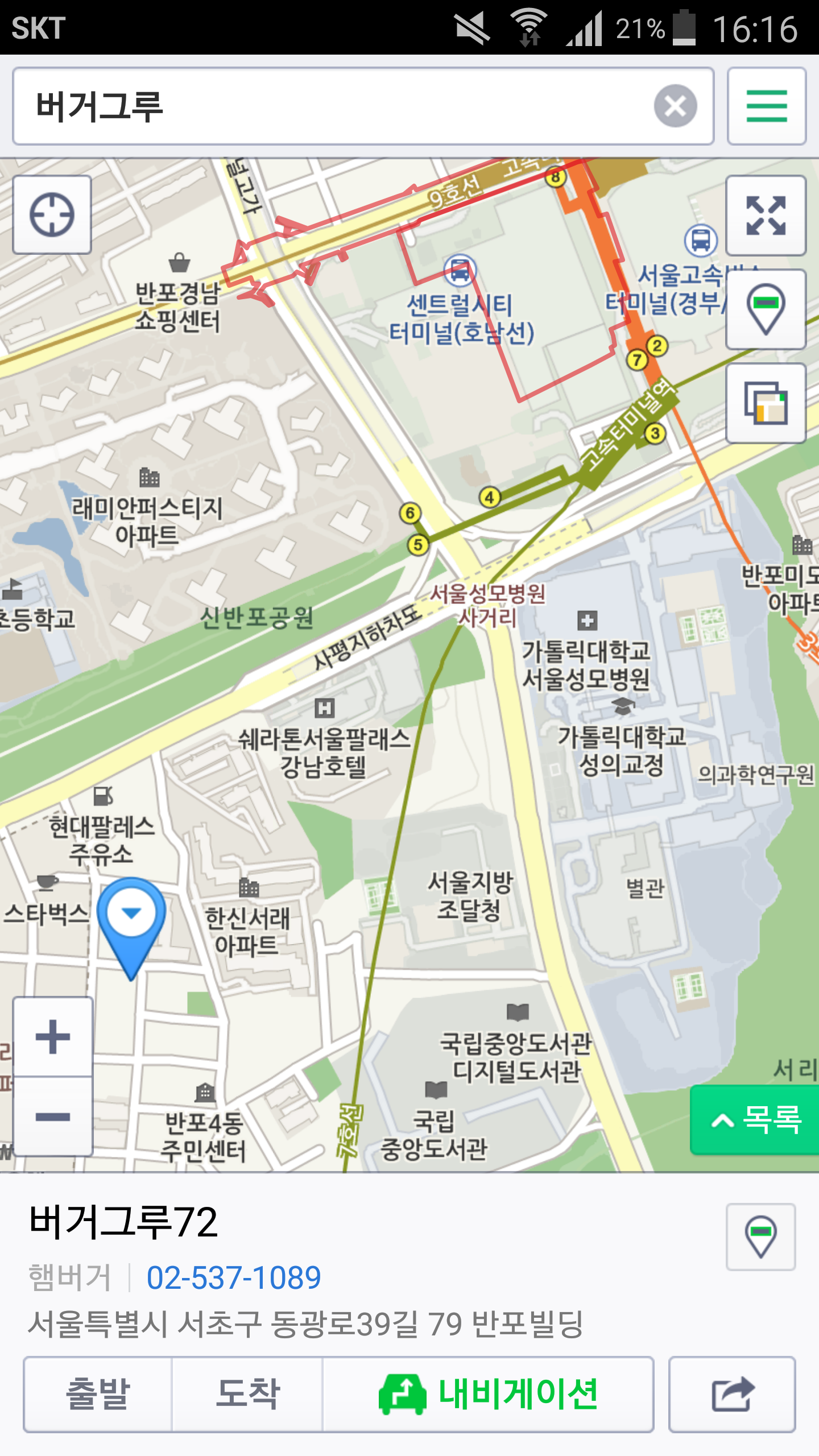 서래마을의 '버거그루72'라는 곳을 소개합니다. 11시부터 22시까지. 21시에 마감. 전 양송이버섯크림버거를 추천합니다.(사진) 고속터미널역 5번출구로 나와 횡단보도 건너서 서래마을 쪽으로 가시면 KEB하나은행이 나오는데 그곳 골목으로 들어가시면 있습니다. 메뉴나 가게의 모습은 아래의 블로그를 참고해주세요. http://naver.me/x92oWSE9 0