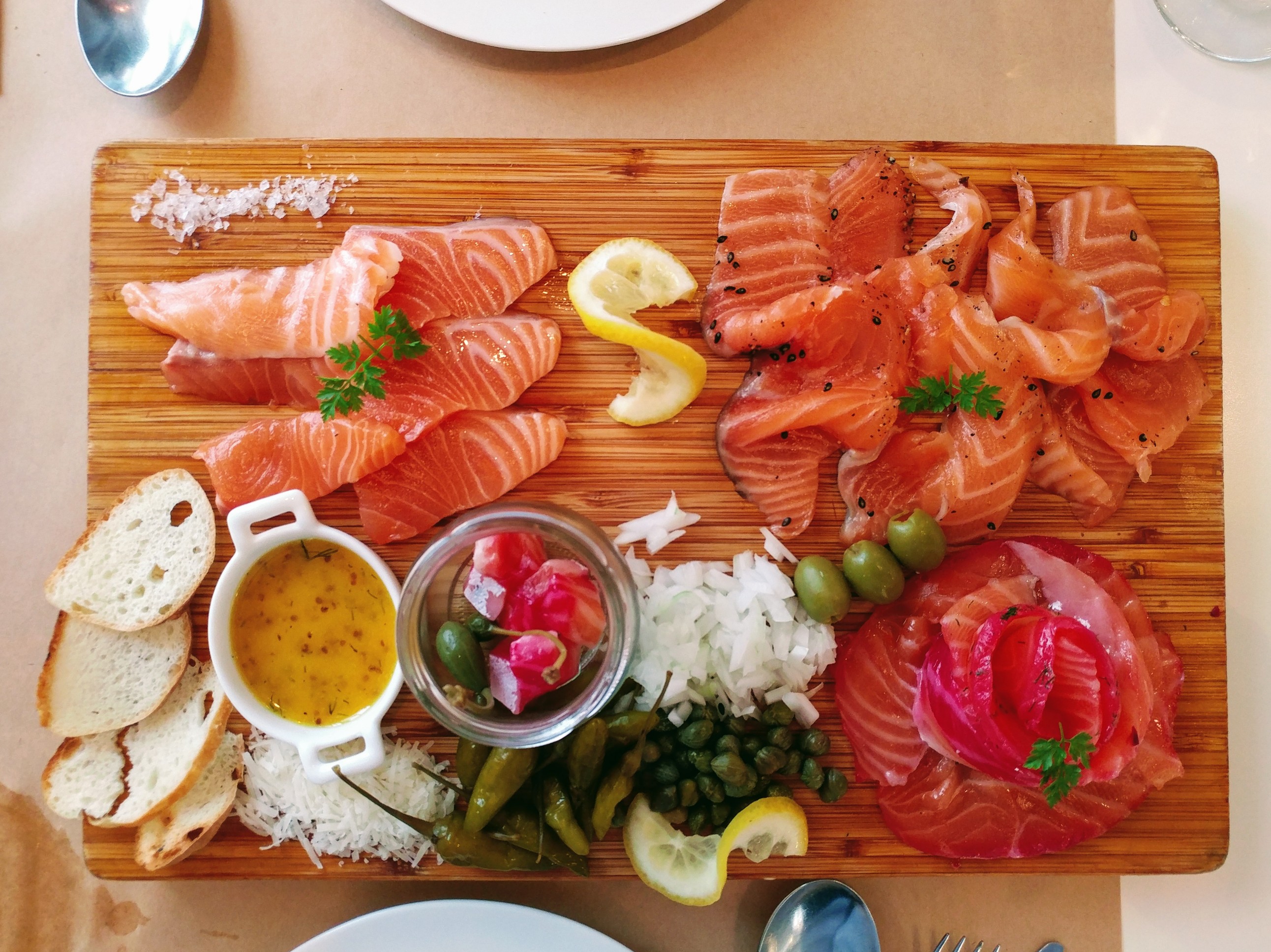 쌜모네 키친에서 가장 유명한 메뉴는 연어 플래터인데, 사진과 같이 연어회를 여러가지 방법으로 조리해서 큰 도마같은데다 펼쳐줍니다.