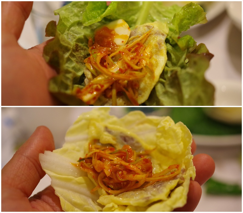 그리고 직원분이 설명하시길 부쳐낸 전을 쌈에 싸서 파채를 올려 먹어보라고 하더군요.