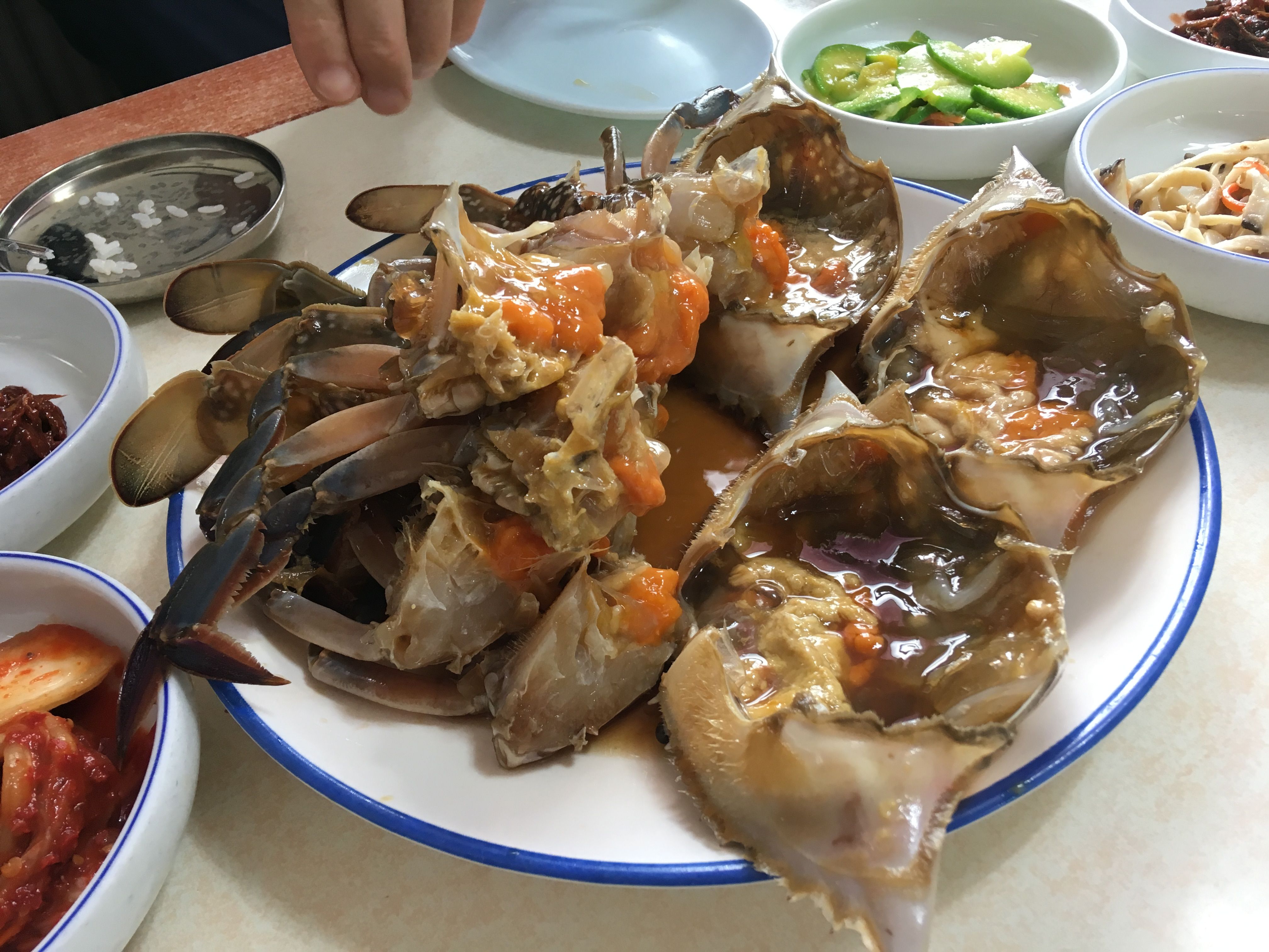 고창에서 간장게장 전문으로 하는 우정회관에 갔습니다. 몰랐는데 가보니 수요미식회에서 소개되었다고 하네요. 간장게장만 팔고 있고 (겨울에는 석화도 판다고 합니다) 큰 사이즈가 1인분 (=1마리) 3만원입니다. 요즘 게값이 많이 올랐는데 이 정도로 살이 꽉찬 게 한마리가 3만원이면 가격 괜찮다고 봅니다. 맛있습니다. 게장 집 답게 화장실에 가그린과 1회용 칫솔도 구비되어 있네요. 양 충분합니다. 꽉찬 1마리 먹고나니, 짜기도 하고 약간 비릿한 맛도 올라와서, 줘도 더 못먹겠습니다.