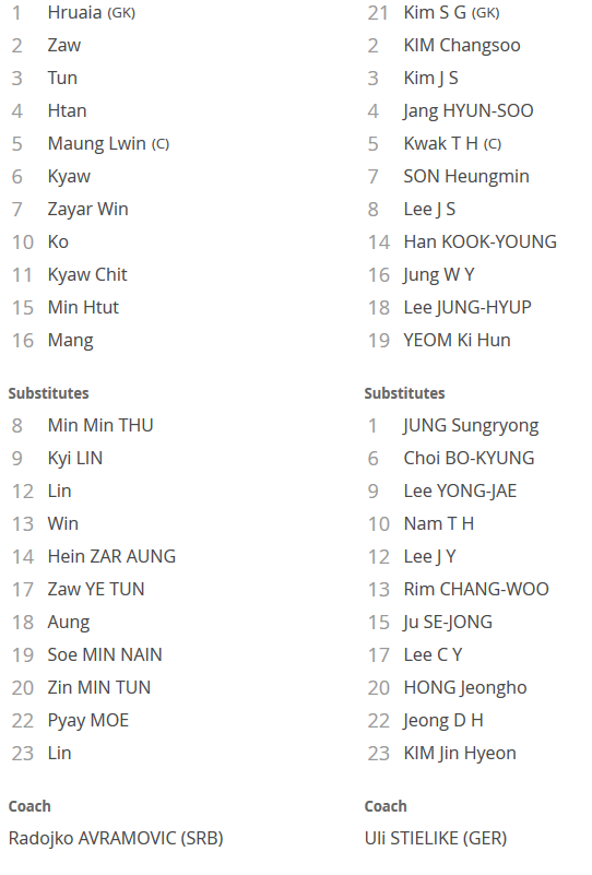 (좌) 미얀마 선발명단 / (우) 대한민국 선발명단 (출처 : FIFA 기록지)